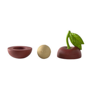 Stack & Bounce – Mery the Chery Stackable toy & Rattle ball is a sensory-rich stacking toy & rattle, made from 100% natural rubber and filled with upcycled cherry seeds to create a soothing sound when shaken.